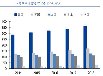 国内运动行业的增长空间,还是非常可观的。智通财经APP了解到,随着国人对运动带来的健康益处的认知加深,以及城市化进程使越来越多的中国人口能够使用优质的体育设施,受经济条件和有限的产品供给而抑制的体育运动参与度将显著增加。数据显示,我国全民的体育运动参与率由2014年的14.7%增长至2018年的18.7%,且各年龄段的参与率都在增加,但与美国35.9%的参与率数据相比仍具有较大差距,预计2023年我国全民的体育运动参与率有望进一步增长至23.4%。而且从我国人均体育消费支出仍有提升空间从消费水平看,无论是从运动鞋服占人均年消费额占比,还是从人均体育消费支绝对值来看,都存在一定的差距,仍有提升空间。