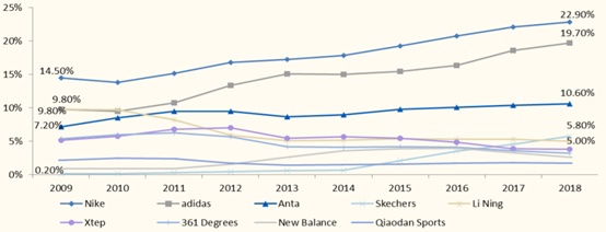 而且不可否认的是,目前耐克、阿迪两大巨头强者恒强的逻辑仍然存在。智通财经APP了解到,耐克和阿迪达斯目前是中国运动鞋服行业排名前2的公司,且市占率在过去10年间逐步提升。2009-2018年,耐克公司市占率由14.5%提升至22.9%,阿迪达斯市占率由9.8%提升至19.7%,得益于在全球范围内领先的功能科技、营销资源和品牌认知,未来耐克和阿迪在中国运动鞋服中高端市场仍将占据有利的市场份额。