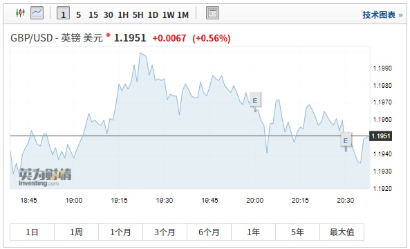 由于英国央行月内已连续两次紧急降息,市场普遍预测英国央行本次会议将暂时维持利率不变。数据公布后,市场短线表现平淡,英镑兑美元小幅波动,截至北京时间20:37,涨0.56%,报1.1951。