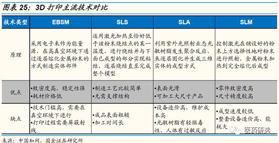 国产自主研发技术不断增强,与国外差距逐渐缩小。目前,医疗3D打印行业涉及的技术主要有电子束选区熔化(EBSM)、选择性激光烧结成型(SLS)、光敏树脂选择性固化(SLA)以及选择性激光熔融(SLM)。