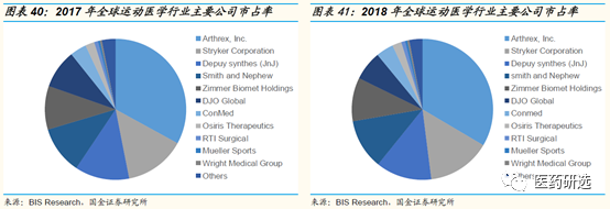 2017年,全球运动医学排名前5的企业合计占据80%市场份额,行业集中度高。Arthrex,Inc.(锐适)独家占据全球约1/3销售额,紧随其后分别是 Stryker Corporation (史塞克)、Depuy Synthes(强生子公司)、Smith and Nephew(施乐辉)、Zimmer Biomet Holdings, INC.(捷迈邦美)。排名前五的公司中仅施乐辉总部位于英国,其余4家均位于美国。