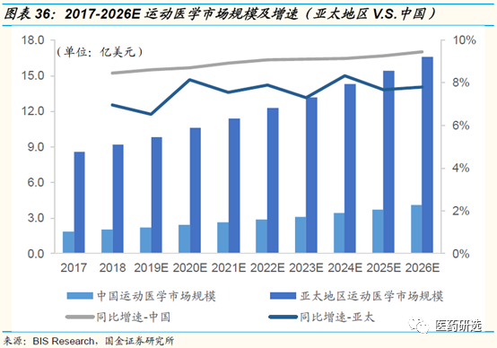 中国运动医学市场规模约占亚太地区的1/4,且增速快于亚太地区平均增速。尽管与欧美国家相比,中国运动医学市场规模尚小,但随着运动医学在中国的不断渗透、发展和普及,中国运动医学市场将持续受益。