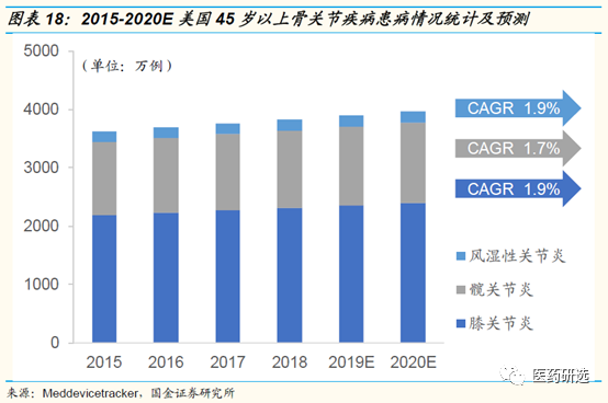 2018年,美国膝关节炎、髋关节炎、风湿性关节炎总病例数分别为2,268万例、1,327万例、184万例,预计2020年将增长至2,398万例、1,371万例、200万例,期间年复合增长率分别为1.9%、1.7%、1.9%。