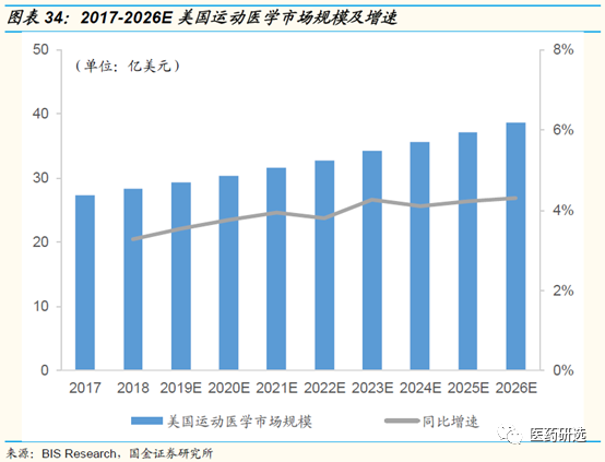 2018年美国运动医学市场规模为28.3亿美元,约占全球市场规模的一半。预计2026年有望达到38.7亿美元,2019-2026年复合增长率约为4.1%。