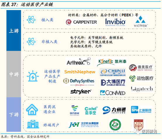 运动医学产业链上游包括植入类与非植入类耗材,中游指运动医学产品及耗材制造商,以海外医疗器械厂商为主,下游主要指运动医学产品流通领域及终端医院。