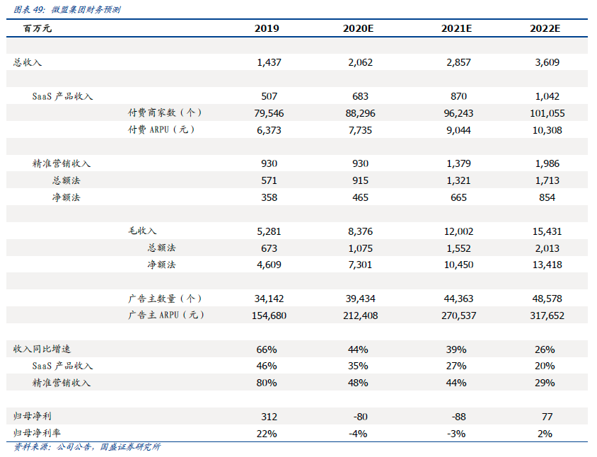 我们预计,2020年公司受公共卫生事件v冲击、SaaS业务投入和收购、精准营销的直销团队增加等因素影响,或出现小幅亏损;但随着公司收入规模增加、精准营销收入贡献提升,后续公司具备持续盈利能力。