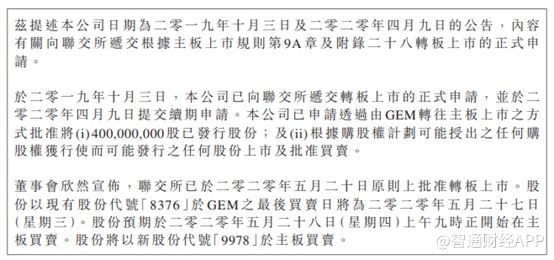 智通财经APP了解到,早在2019年10月3日就根据主板上市规则向联交所递交了转板申请,今年4月提交续期申请后,最终获得联交所转板批准。根据公告,公司将把4亿股已发行股份及根据购股权计划可能售出的股份上市流通。