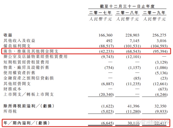 2017年至2019年,方圆房服收入分别为1.66亿、2.29亿和2.56亿元人民币(单位下同),年复合增长24%,年内溢利分别为-665万、3012万及2242万,可以看到波动较为明显。2019年公司在收入同比增长11.8%的情况下,净利润下滑25.6%,主要是因为公司的广告、推广及其他佣金开支从2018年的6854万增加至9539万,同比增加39%。