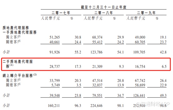 2019年,房地产代理服务收入占比98.6%,依然是核心收入来源,不过其中线下一手房产代理服务收入占比42.8%,二手房产代理服务收入占比更是从2017年的17.3%降至2019年的6.5%。网上转介平台的收入占比逐渐攀升,2017年至2019年收入占比分别为23.8%、34.7%及49.3%,2019年已经与线下业务持平。