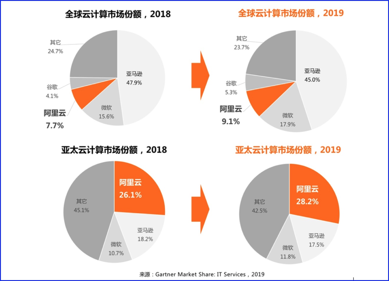 国际研究机构Gartner的数据也显示,2019年阿里云的全球市场份额从7.7%上涨至9.1%,排名第三,在亚太区域市场份额从26%上涨至28%,接近亚马逊和微软总和。