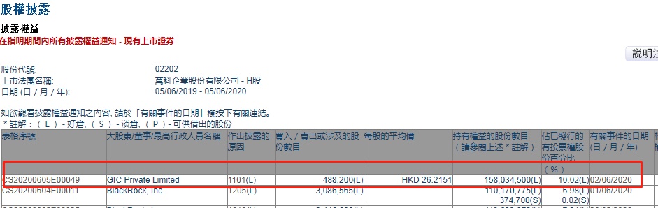 智通财经APP获悉,联交所最新资料显示,6月2日,GIC Private Limited增持万科企业(02202)48.82万股,每股作价26.2151港元,总金额约为1279.82万港元。增持后最新持股数目约为1.58亿股,最新持股比例为10.02%。