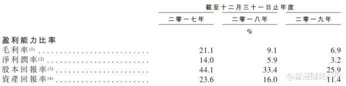 然而,毛利率及净利率表现则有所下降,毛利率由2017年的21.1%下降至2019年的6.9%;净利润率由2017年的14%下降至2019年的3.2%。