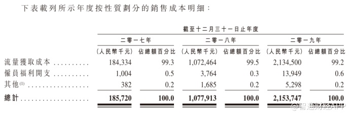据智通财经APP获悉了解到,2017-2019年间,公司销售成本占收比由78.89%增长至93.11%,成为侵蚀公司毛利表现的最大影响因素。具体来看,雇员福利开支在公司销售成本中仅占了很小一部分,而主要由流量获取成本构成。