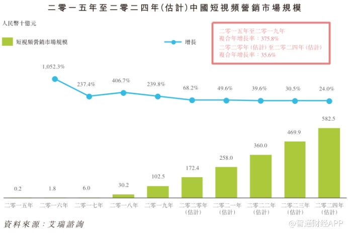 2015-2019年,短视频内容市场规模复合年增长率达到401.5%。据艾瑞咨询预计,短视频内容市场规模于2020-2024年的复合年增长率将达到35.3%。其中,短视频营销收入复合年增长率则将于2020-2024年达到35.6%。