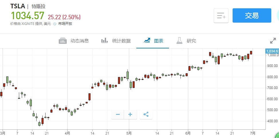 智通财经APP获悉,今日(6月30日)美股盘初,截至北京时间22:06,特斯拉(TSLA.US)涨2.60%,报1035.97美元,刷新盘中纪录新高,市值突破1900亿美元。