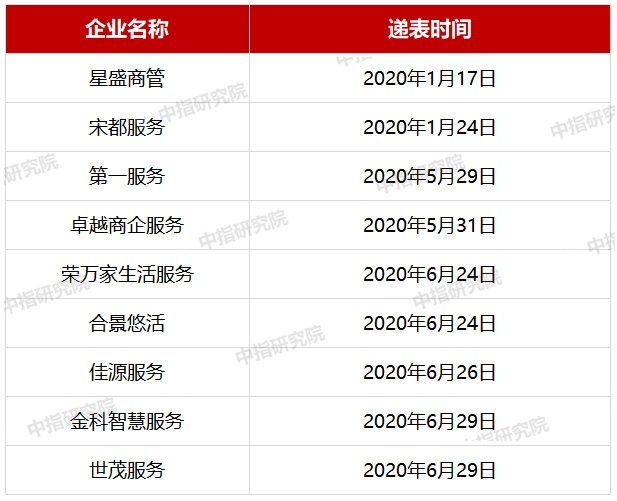 今年以来,共有9家物业服务企业向港交所递交A1,其中6月下旬集中交表5家。而此前,华润置地、阳光城、禹洲地产、越秀地产、合景泰富、朗诗地产已公开表示分拆物业板块上市,预计下半年依旧会延续上半年的火热形势,到2020年底,上市物业企业总数会达到50家左右。