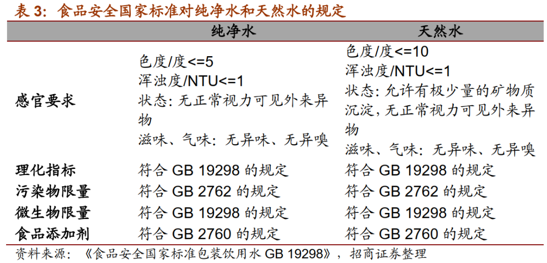 纯净水和天然水虽工艺不同,但成品的安全标准并无本质差异。虽然天然水采用的过滤工艺精度相对更低,但是食品安全国家标准对两种水的成品要求基本一致,主要包括感官要求、理化指标、污染物限量、微生物限量、食品添加剂五个方面。如下表所示,除感官要求略有差异,纯净水和天然水需达到的其他要求都相同,浙江省包装饮用天然水标准在符合国家标准GB19298的基础上,还额外提出了部分指标要求。
