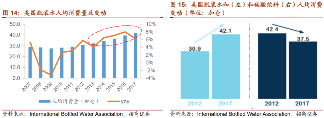 后来消费者健康意识增强,低糖低热成为诉求,瓶装水被视作含糖饮料的替代品,推动小包装水快速发展。除代替自来水解决美国居民对公共供水系统的信任危机,国际瓶装水协会、美国饮用水基金会等机构也倡导消费者选择无糖健康的瓶装水代替含糖饮料。2009年后美国饮料市场增长最好的是与有益、功能相关的品类,比如包装水、能量饮料、运动饮料等。2007年到2017年十年间,瓶装水人均消费量增加13加仑达到42加仑,同期碳酸饮料人均消费量下滑11加仑,牛奶、果汁等饮料消费量也在下降,咖啡和茶保持稳定。