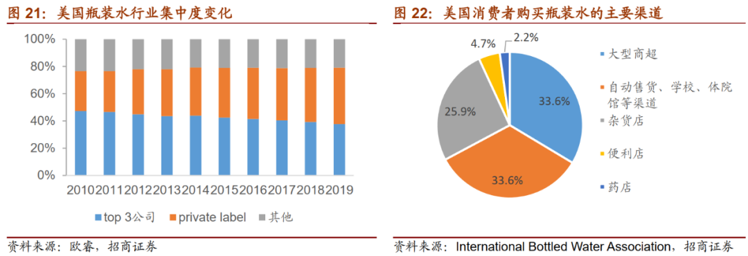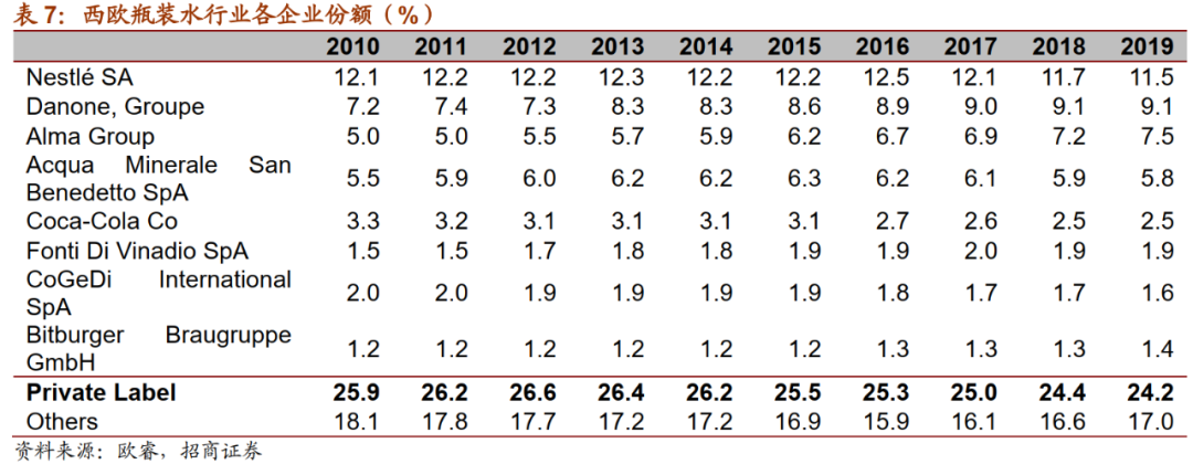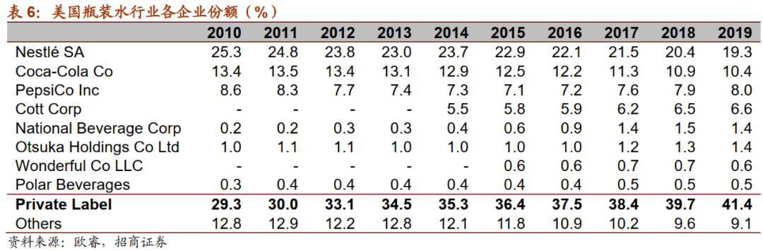 欧美包装水市场格局分散,快消巨头、本地品牌和自营品牌三方竞争。欧睿数据显示,美国和西欧市场CR5都不到50%,份额排名靠前的公司为雀巢、可口可乐、达能等快消巨头。根据国际瓶装水协会,美国市场也存在大量的本地品牌,这些公司大多是当地家族企业,与当地社区关系深厚,使用本地水源,配送范围在300英里以内。美国瓶装水公司中60%的公司年销售额不足200万美元,90%公司年销售额不到1000万美元。此外,零售商自营品牌也是市场中的重要力量,且在美国份额不断提升。渠道商巨头通过大量进货具有强大的议价能力,通过低价策略抢占市场,美国瓶装水行业中自有品牌份额从2010年29.3%提升至2019年41.4%。在西欧市场,自由品牌占比约24%,以英国为例,Tesco和Asda超市自营品牌分别排名第4和第6,份额为9.7%和5.5%。