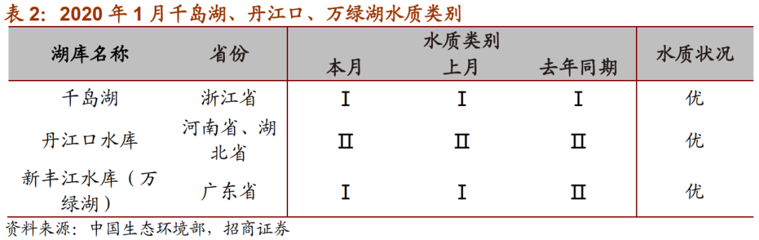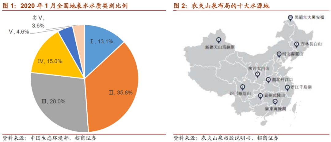我国地表水按功能高低依次划分为五类,Ⅰ-Ⅲ类为可饮用水源,满足Ⅰ-Ⅱ类标准的天然水源水质更优。根据《2020年1月全国地表水水质月报》,我国检测的1932个国考断面中,Ⅰ类水质占比13.1%,Ⅱ类占35.8%,Ⅲ类占28.0%。月报中检测的全国50个重要水库中,千岛湖、丹江口水库、新丰江水库(万绿湖)均是农夫山泉布局的重要天然水源,根据检测报告这几处水源均满足Ⅰ-Ⅱ类标准,水质较优。