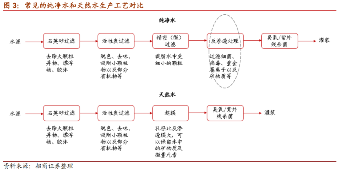 过滤和杀菌是包装水生产的基本工艺,纯净水过滤精度更高,天然水及矿泉水重在保留原有的矿物质和微量元素。纯净水生产中反渗透处理是核心工艺,反渗透膜孔径多在1nm之下,可过滤掉原水中的细菌、病毒、重金属离子、有机物等,但同时也会过滤掉矿物质。由于纯净水水源是自来水,水污染严重下反渗透处理必不可少。此外,也有部分纯净水采用蒸馏技术代替反渗透处理,同样会去除掉水中的矿物质和微量元素。对于天然水和矿泉水,水源标准高、水质较优,因此生产中无需反渗透处理,大多采用超滤膜过滤(孔径大于反渗透膜),以最大程度保留水中含有的矿物质和微量元素。