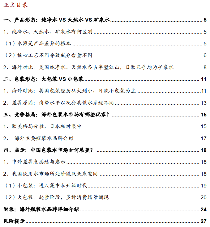 包装形态:大包装VS小包装。1)海外对比:美国包装水经历从大到小,日欧小包装为主。美国包装水直饮消费为主,早期驱动为居民对市政供水系统的不信任,面向家庭和企业的大包装水主导市场。后来PET瓶装水代替含糖饮料,购买便捷,市场份额由20世纪初的24%提升至67%。而日本欧洲瓶装水类似饮料,规格基本在2L以下。2)差异原因:经济发展水平以及公共供水系统不同。天然矿泉水相比纯净水定位更高端,结构上的差异受制于消费水平的高低。另外,公共供水系统也是重要的影响因素。比如我国自来水水质较差,大包装水除直饮外,还存在煮饭、泡茶、餐饮等多种消费场景。