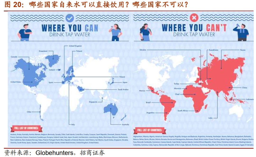 公共供水水质的差异导致不同国家瓶装水行业结构特点不同。我们国家采用常规工艺处理后的公共自来水水质仍较差,不能直接饮用,驱动居民日常饮水的包装化以及中大规格家庭消费场景的兴起。但是美国、日本以及欧洲部分国家,水源保护较好,自来水净化工艺以及运输管道等基础设施建设比较发达,公共供水可以直饮。叠加国内外经济水平及消费能力的差异,海外包装水市场的发展路径以及产品结构等呈现出与我国不同的特点,比如供水系统发达的国家,瓶装水中天然矿泉水占比高,重在宣传含有矿物质、天然健康等特点,作为含糖饮料的一种替代品。另外,自来水水质较优的情况下,大包装水家庭消费场景缺失。