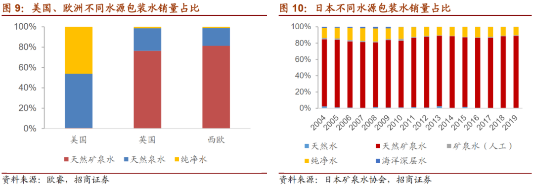 其次是产品结构升级:从纯净水到天然水和矿泉水的升级路径有望实现,最终理想状态是类似日本和欧洲,小包装以价格接近饮料的天然矿泉水为主。参照海外经验,随着消费能力提升以及健康意识增强,叠加企业持续的消费者教育,小包装水形态将越来越偏向于天然矿泉水,作为其他饮料的替代。我国上游矿泉资源足够丰富,关键因素在于消费者对不同水产品差异的认知以及消费升级带动。