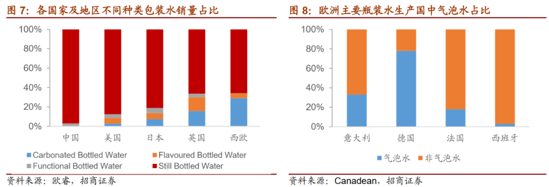 日本、欧洲调味瓶装水、气泡水消费更多,饮料特征明显。根据欧睿数据,瓶装水可以分为碳酸瓶装水、调味瓶装水、功能瓶装水以及静态瓶装水,我们平时常见的无气泡无味道的纯净水、天然水以及矿泉水等都属于最后一种静态瓶装水。中国包装水基本不添加风味、气泡或者功能,但在日本和欧洲,调味瓶装水、气泡水等受到消费者欢迎,定位更类似饮料。比如日本瓶装水龙头三得利集团除经典款Tennensu天然矿泉水,还推出柠檬、蓝莓、白桃、芦荟等口味的矿泉水或气泡水。根据Canadean调查数据,欧洲有40%的消费者更偏好饮用气泡水,主要瓶装水生产国中,德国气泡水占比高达78%,意大利和法国占比分别有33%和18%。