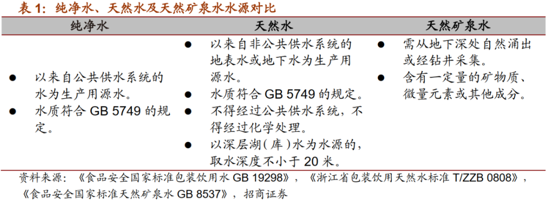 根据2015年包装饮用水新国标,我国包装水分为饮用纯净水、其他饮用水和天然矿泉水三类,以农夫山泉为代表的天然水属于其他饮用水类别。市场关于饮用水的宣传眼花缭乱,消费者对不同种类的包装水尚未形成清晰认知,我们对水源、生产工艺、国家标准、成分含量等进行梳理,从产品力角度深入探讨不同种类包装水的差异。