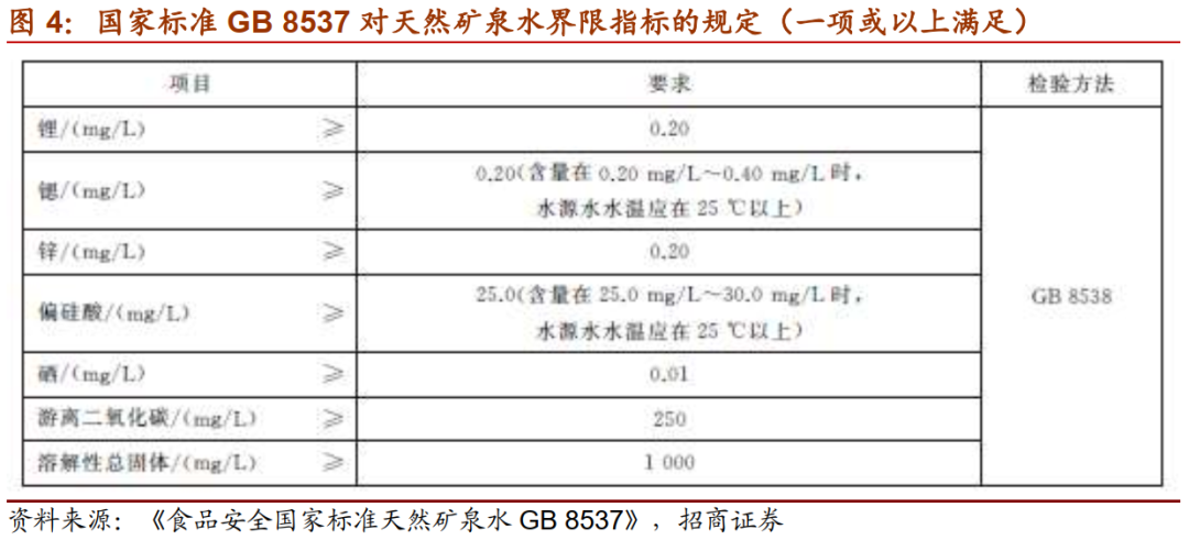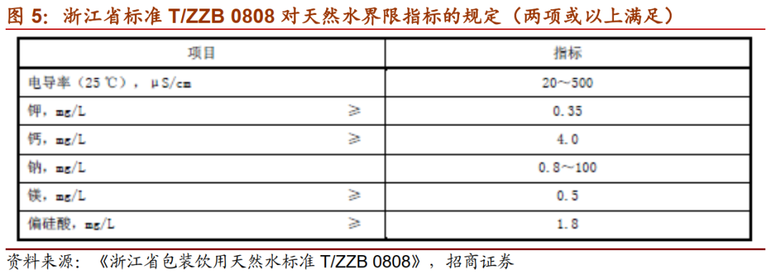 差异在于是否含有矿物质及微量元素。在安全标准上,纯净水与天然水并无显著差异,关键在于矿物质含量。国家标准GB8537对天然矿泉水成分有明确的指标要求,必须有一项或以上指标符合规定(如表4)才可以成为天然矿泉水。对于天然水,国家标准虽无明确规定,但浙江省标准T/ZZB0808要求天然水中成分必须有两项或以上指标达到相应规定(如表5)。以怡宝纯净水、农夫山泉天然水、百岁山矿泉水为代表对比,通常情况下,矿物质含量纯净水(无矿物质)<天然水<矿泉水。