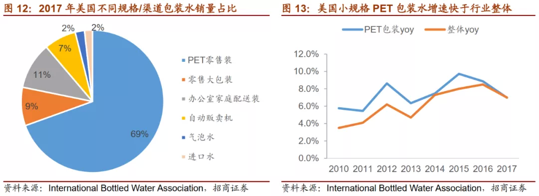 美国包装水直饮消费为主,小规格PET包装增速更快。从规格来看,美国大包装水可以分为零售大包装(1-2.5加仑)和办公室家庭配送装(3-5加仑)两类,销量分别占比8.7%和10.6%。但是消费场景与我国不完全一致,美国消费者购买大包装水仍以直饮为主,我国4-5L以及8L以上包装水除直饮外,还有煮饭、泡茶等家庭生活用水,以及餐饮渠道如火锅底汤等消费场景。在美国,由于小规格PET包装水购买便捷受到消费者青睐,增速明显快于整体瓶装水行业。在90年代中期,美国办公室家庭配送装曾是占比最高的品类,受到PET瓶的激烈竞争,份额一路下降。零售大包装(1-2.5加仑)亦是如此,市场份额从21世纪初的近25%下降至2017年不到9%。而1999-2009十年间PET包装水一直保持双位数增长,2009-2017年间复合增速下降至7.4%,仍高于整体增速,市场份额从1999年24%增长至2017年67%。