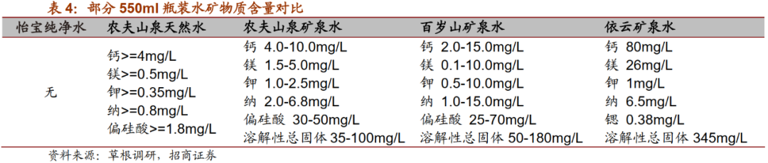 产品力虽有区分,但直接效果不明显,消费者尚未能清晰辨识。纯净水、天然水和矿泉水水源不同,工艺亦不同,最终产品差异体现在矿物质及微量元素含量。但是由于饮用水对人体的直接效果不明显,目前消费者还未能清楚认识各种包装水的差异,比如同为纯净水的品牌价格有1元有2元(550ml左右),而同为2元价格带的包装水有纯净水也有天然水,还需要厂商围绕差异加大消费者教育。随着大包装家庭消费场景的兴起,长期使用时消费者会去关注水源、水质、成分含量等因素,天然水及天然矿泉水的产品力有进一步被认知的可能。