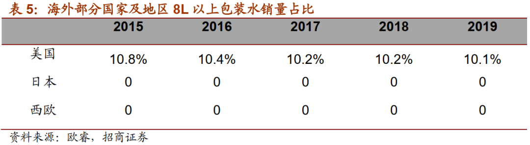 (4)我国饮水环境与美国更类似,但也有两点区别。从目前来看,我国包装水的消费更多是替代自来水而非其他饮料产品,行业增长的驱动力是经济发展水平、城镇化率提升以及健康意识增强带来的饮水包装化率提升,这一点类似美国包装水行业发展的早期阶段。而且我国包装水结构与美国十分类似,从产品形态看,都有较大比例的纯净水,从包装形态看,大、小包装并重。但是我国饮水习惯与美国也存在两点区别:1)中国人相对美国人更有喝水的习惯,其他饮料消费相比较少,尤其是碳酸饮料,因此包装水在我国的天花板理论值更高;2)中国人习惯烧开水,一是通过煮沸进行家庭端的净水杀菌,二是中国人本身有喝热水的习惯,这对于包装水潜在空间的理论值有一定削弱。