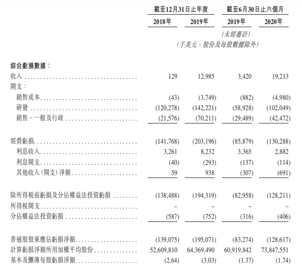 截至2018年及2019年12月31日止年度以及截至2020年6月30日止六个月,再鼎医药的营收分别为12.9万美元、1298.5万美元及1921.3万美元;亏损净额分别为1.39亿美元、1.95亿美元及1.29亿美元。