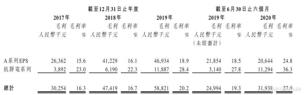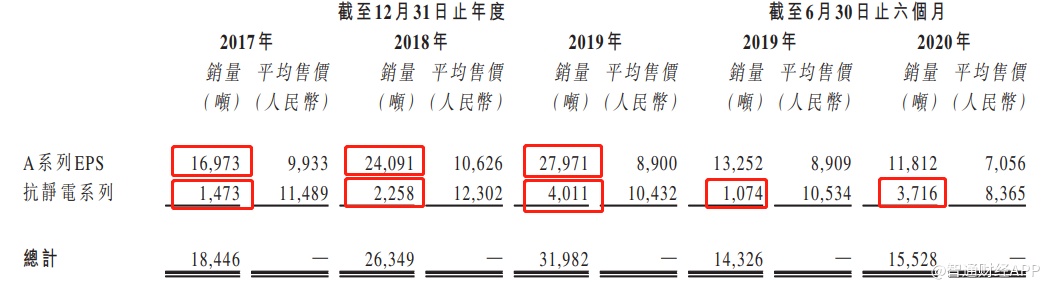 从销量来看,无论是A系列EPS或是抗静电系列,两大产品均实现了稳步增长。智通财经APP发现,从2017年至2019年,A系列EPS的销量从1.7万吨增至2.8万吨,年复合增速28.45%;2020年上半年则因为疫情影响有所下滑。抗静电系列方面,其销量从2017年的1473吨增至2019年的4011吨,年复合增速近65%;即使在2020年上半年,抗静电系列产品销量仍同比大增246%,接近2019年时的全年水平。