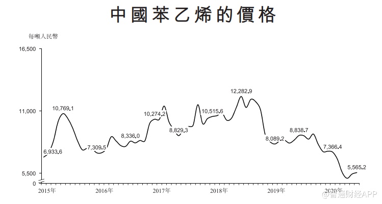 而在原材料方面,苯乙烯是公司的主要原材料。2019年时,苯乙烯在原材料中的占比为86.3%。了解苯乙烯价格,便对裕河控股的原材料成本变化有清晰认识。而苯乙烯来源于石油,其价格与石油价格密切相关。2018年以来,由于全球经济的低迷,油价走低,苯乙烯价格亦一路向下;进入2020年后,苯乙烯价格更是在石油价格大幅下降后创下5年新低。