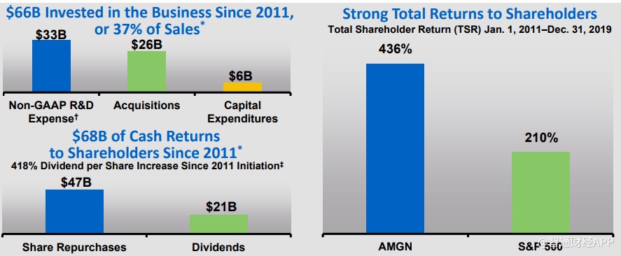 安进是一家领先的生物技术公司,在100个国家设有分支机构,生产的创新药物遍及全球数百万人。它有许多有前途的新药和不断增长的生物相似的实践。尽管卫生事件导致公司在近期面对一些挑战,但管理层对2020年全年持续增长持有信心。从长期来看,中国和日本对该公司来说是有吸引力的增长市场,因为这两个市场分别是全球第二大和第三大制药市场。最后,管理层通过过去10年强劲的资本回报,展示了对股东的友好。