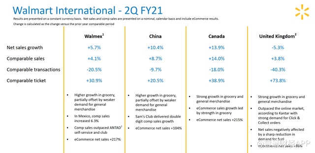 不仅受到卫生事件的提振,电商业务自身也将继续显示出强劲势头,这将成为沃尔玛深入寻找销售增长的关键领域。从第二财季开始,沃尔玛在美国地区外(包括英国、中国、墨西哥和加拿大)的电商销售额增长已经达到98%至217%,而同店交易额则下滑9.7%至40.3%(如下图所示)。