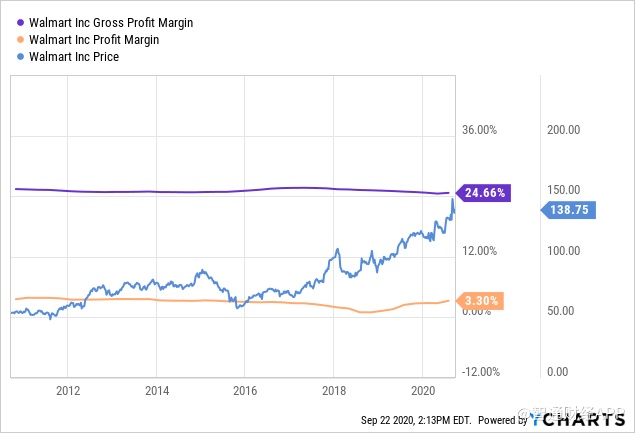 沃尔玛为顾客提供价值的商业模式是以低利润率为代价的。公司毛利率一直徘徊在24.5%至25.7%之间,而净利率在2018年底下滑至1%后,目前也仅保持在3%以上。