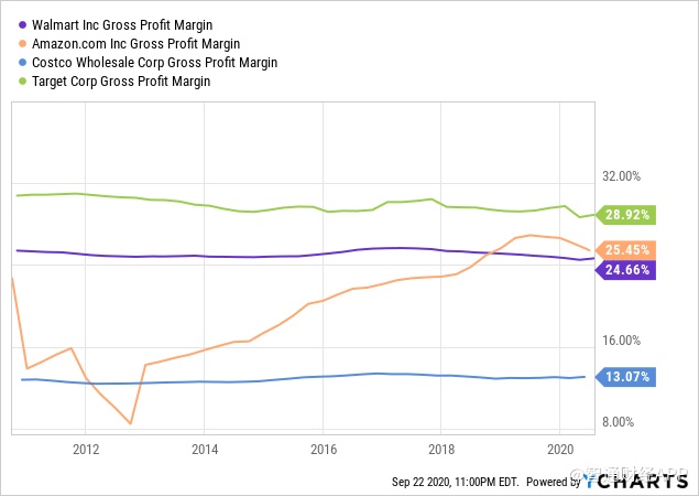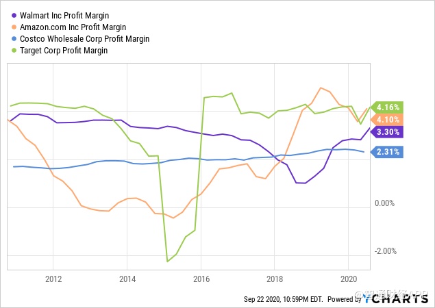在同行中,塔吉特的毛利率最佳,而亚马逊自2013年以来凭借其快速增长,在过去一年里赶超沃尔玛。沃尔玛、好市多以及塔吉特由于其商业模式,即为顾客提供价值、批发购买/销售以及低价的性质,因此在利润率方面非常稳定。