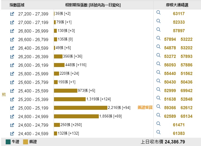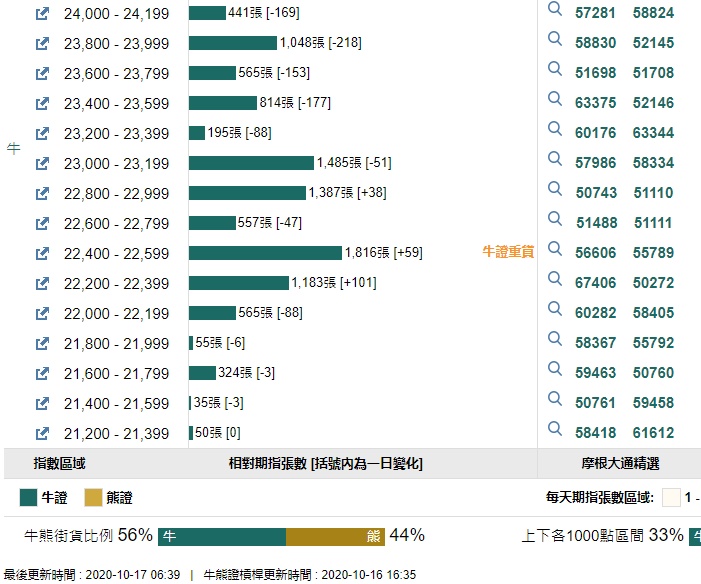 智通财经APP获悉,截至10月16日,恒指最新的牛熊街货比例56:44。摩根恒指牛熊证街货分布图中的数据显示,熊证街货重货区在25000-25199区间,该区间最新熊证数量为2216张,较上一交易日增加94张;最多新增在24600-24799区间,该区间最新熊证数量为250张,较上一交易日增加250张。牛证街货重货区在22400-22599区间,该区间最新牛证数量为1816张,较上一交易日增加59张;最多新增在22200-22399区间,该区间最新牛证数量为1183张,较上一交易日增加101张。
