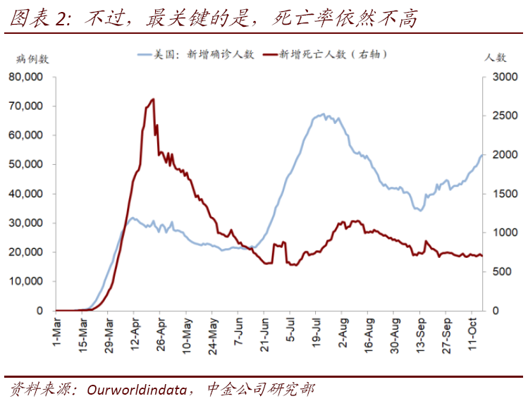 9月下旬以来,美国疫情再度抬头,7天日均新增从9月中旬3.5万人的低点逐步抬升并在过去一周呈加速态势,目前已升至5.2万人(7月底峰值6.7万)。按照这个势头看,“第三波”疫情已经基本形成。整体上,市场对于疫情的关注度不断下降、疫情本身的毒性似乎也在边际递减(如死亡率维持低位),因此借鉴美国6月中到7月底“第二波”疫情经验,整体冲击可能依然有限,但一些边际变化和影响依然值得关注: