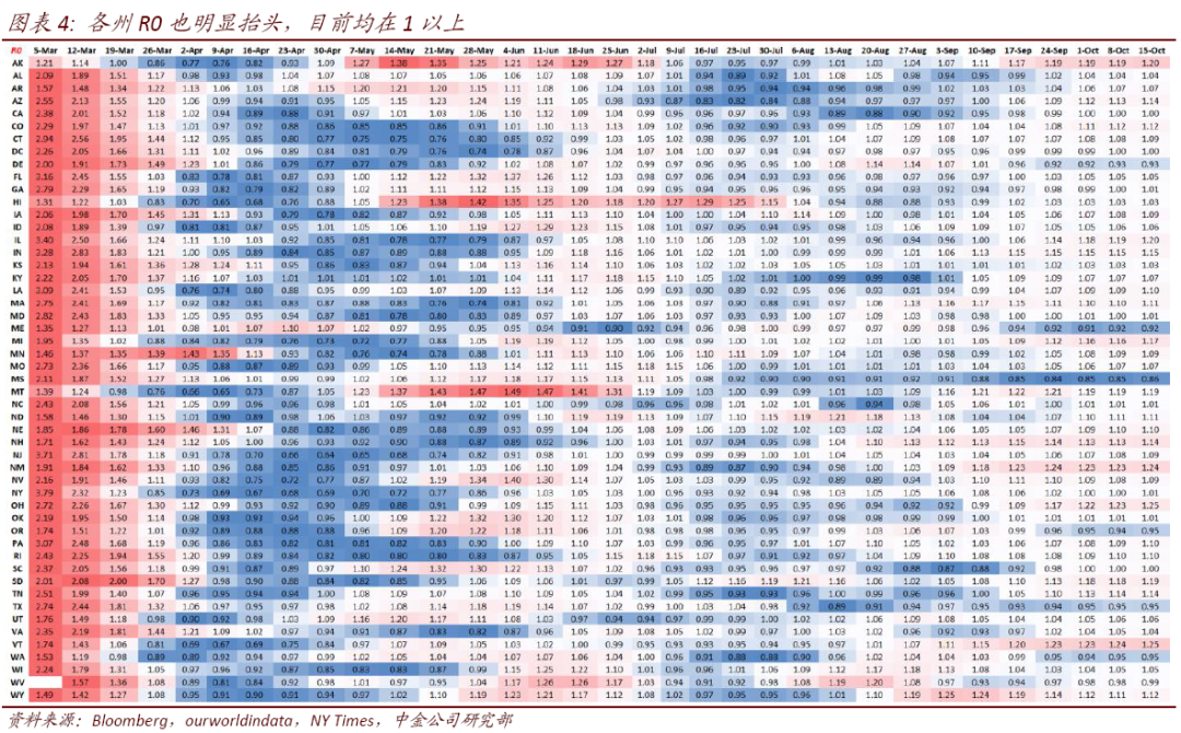 i. 此轮疫情集中在中西部,但死亡率依然不高。与第一波中心在纽约、第二波在佛罗里达和加州不同,这一轮疫情中心集中在中西部州。各州R0也明显抬头,目前均在1以上,由于这些州大多处于复工重启状态且尚未采取明显防控措施,因此大概率会延续一段时间。不过最为关键的是,与第二波类似,目前的死亡率依然不高。