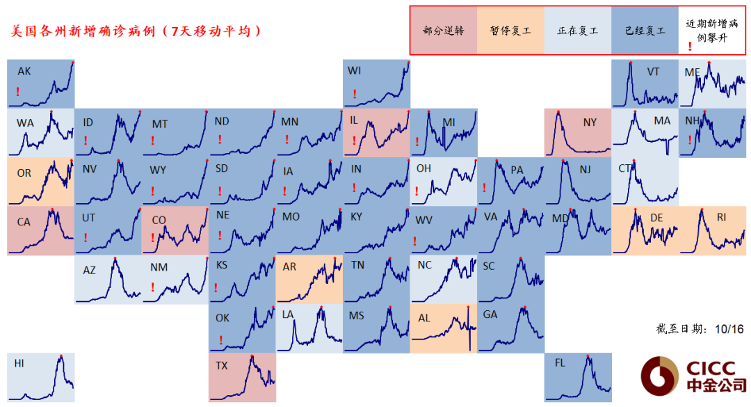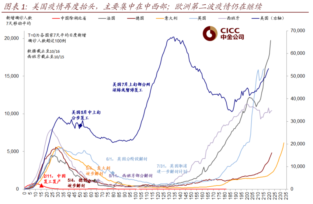 几个边际变化值得关注:1)目前的死亡率依然不高;2)或再度阶段性拖累复工进展,但不至于完全逆转;3)常态化疫情拖累产能爬坡,导致库存去化和进口增加以满足需求;4)但,与第二波疫情不同的是,此轮疫情与政策刺激出现“错期”,不排除扰动市场情绪;5)对大选可能影响:疫情控制满意度与邮寄选票;6)美欧疫情“错期”对资金流向和汇率的可能影响