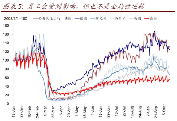 ii. 或再度阶段性拖累复工进展,但不至于完全逆转。从复工状态看,目前疫情严重的主要中西部州都依然在开放进程中,因此不排除会再重新采取一定限制措施,最新一些高频指标也有所体现,如出行、就餐等。不过,第二波疫情经验告诉我们,只要死亡率不高,部分限制会导致复工进程暂停但并非全局性逆转。