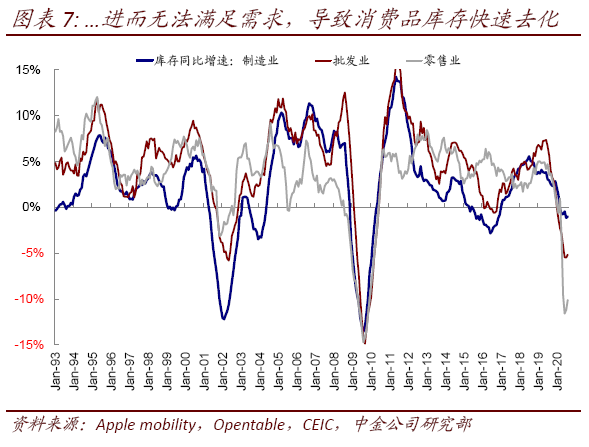 iii. 常态化疫情拖累产能爬坡,导致库存去化和进口增加以满足需求。但中期来看,在疫情研制成功且能够大范围应用前,美国第三波和欧洲第二波表明疫情正在往常态化方向发展。尽管常态化疫情不会像3月第一波那样造成如此急剧的影响和恐慌,但依然会拖累复工进展和产能爬坡。目前欧美复工进展仅修复至66%,明显落后于中国的104%。在消费需求稳健的背景下,供给迟迟无法跟上(9月美国零售消费环比1.9%,大幅好于预期;而9月工业产出却意外下滑),会使得库存快速去化(美国消费品库存增速都降至历史低位)并加大进口需求,甚至逐步开启新一轮补库周期。