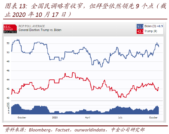 考虑到大选临近和特朗普选情依然吃紧(目前全国民调依然落后~9%)、美国第三波疫情开始显现、财政谈判僵局等等,前期过于乐观的预期不排除会面临修正。因此,我们依然维持在海外资产配置10月报(《大选冲刺期的配置策略》)中观点,短期内市场可能维持震荡格局,因此控制仓位、做多波动率可能都是不错的选项。