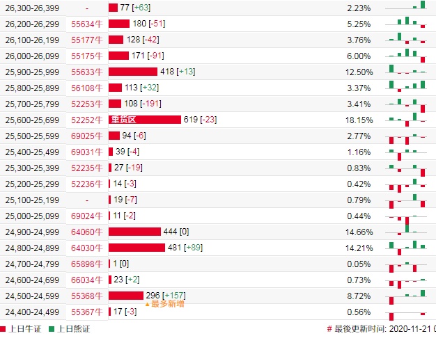 智通财经APP获悉,截至11月20日,恒指最新的牛熊街货比例54.7:45.3。法兴恒指牛熊证街货分布图中的数据显示,熊证街货重货区在26700-26799区间,该区间最新熊证数量为1287张,较上一交易日增加84张;最多新增在28000-28099区间,该区间最新熊证数量为209,较上一交易日增加121张。牛证街货重货区在25600-25699区间,该区间最新牛证数量为619张,较上一交易日减少23张,最多新增区在24500-24599区间。