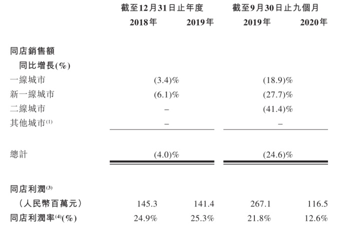 其中,2018-2019年同店销售额同比下降4%;2019-2020年止九个月则同比下降24.6%,其中二线城市下降更为明显。同店利润率方面,2018-2019年实现由24.9%到25.3%的增长,2019-2020年止九个月则出现了由21.8%到12.6%的下降。